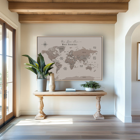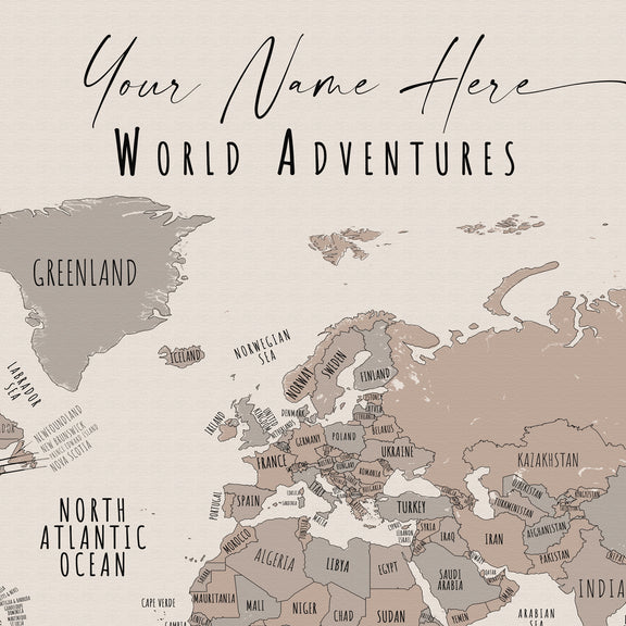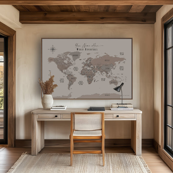 Cette carte du monde sur mesure est une œuvre d'art unique, faite à la main, et est inspirée par le Serengeti, Tanzanie. Elle est créée sur commande, personnalisée à la main et peut compléter n'importe quelle décoration intérieure. La carte est une œuvre d'art durable et de haute qualité - un investissement que vous chérirez comme une belle pièce maîtresse pour mettre en valeur vos aventures.