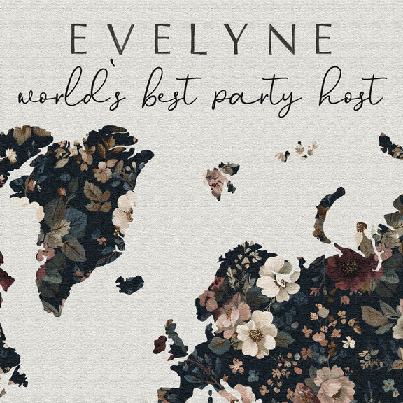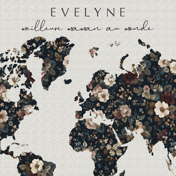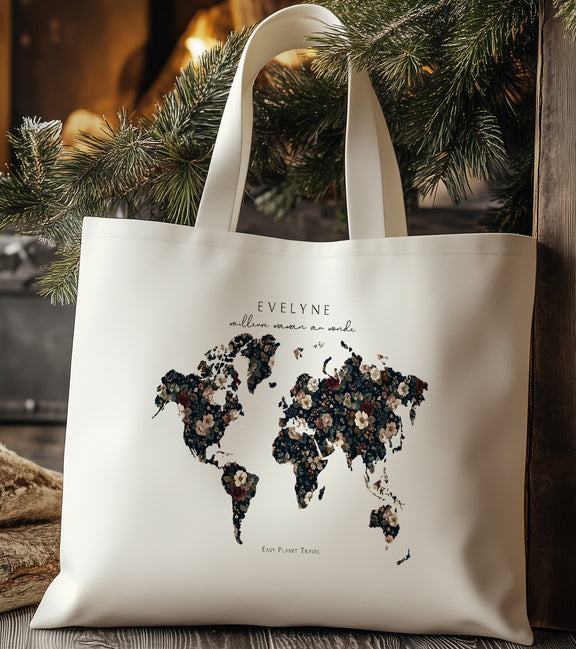 Ce sac fourre-tout en toile personnalisé arbore un magnifique motif botanique sur fond de carte du monde, ce qui en fait le cadeau idéal pour les voyageurs ou pour remercier un enseignant. L'imprimé floral bleu marine foncé avec ses touches de verdure crée une esthétique élégante tout en offrant un sac pratique pour les courses et le quotidien.
