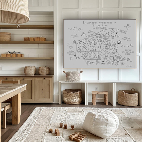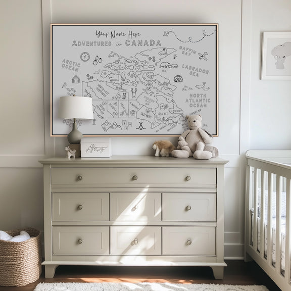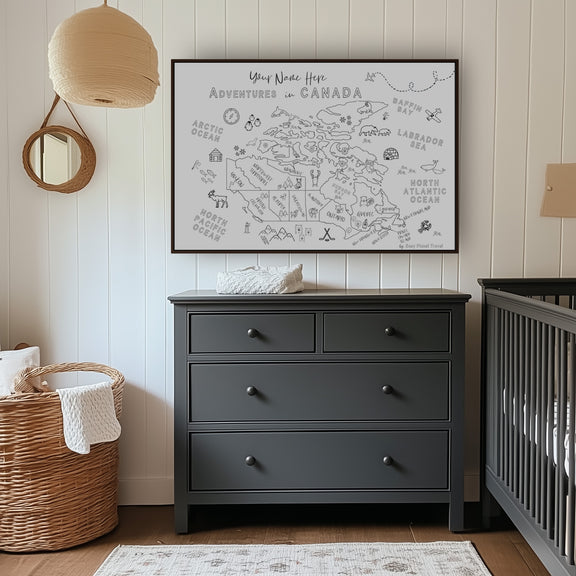 This custom-made map for your child is a unique, handmade work of art. It's created to order, personalized by hand, and can complement any bedroom or playroom decor. In Black and White.